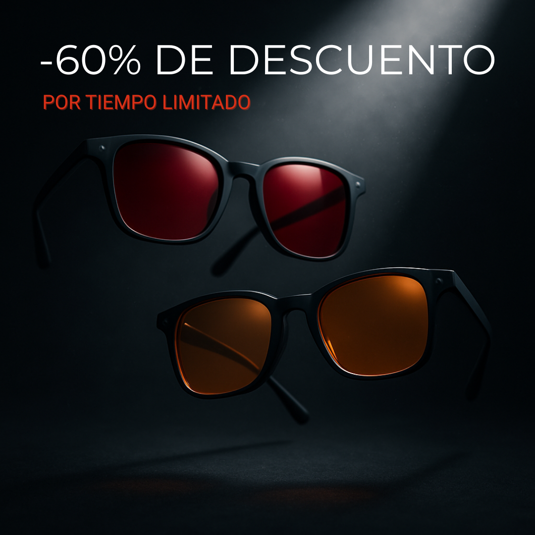 Las lentes rojas filtran ese tipo de luz, ayudando a que la vista se relaje y facilitando una transición más cómoda hacia tu rutina nocturna.