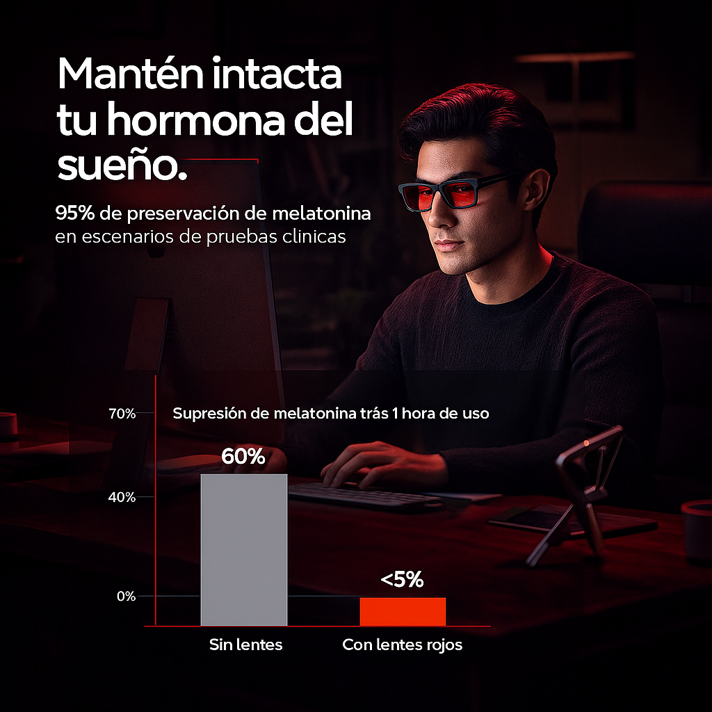 Las lentes rojas filtran ese tipo de luz, ayudando a que la vista se relaje y facilitando una transición más cómoda hacia tu rutina nocturna.