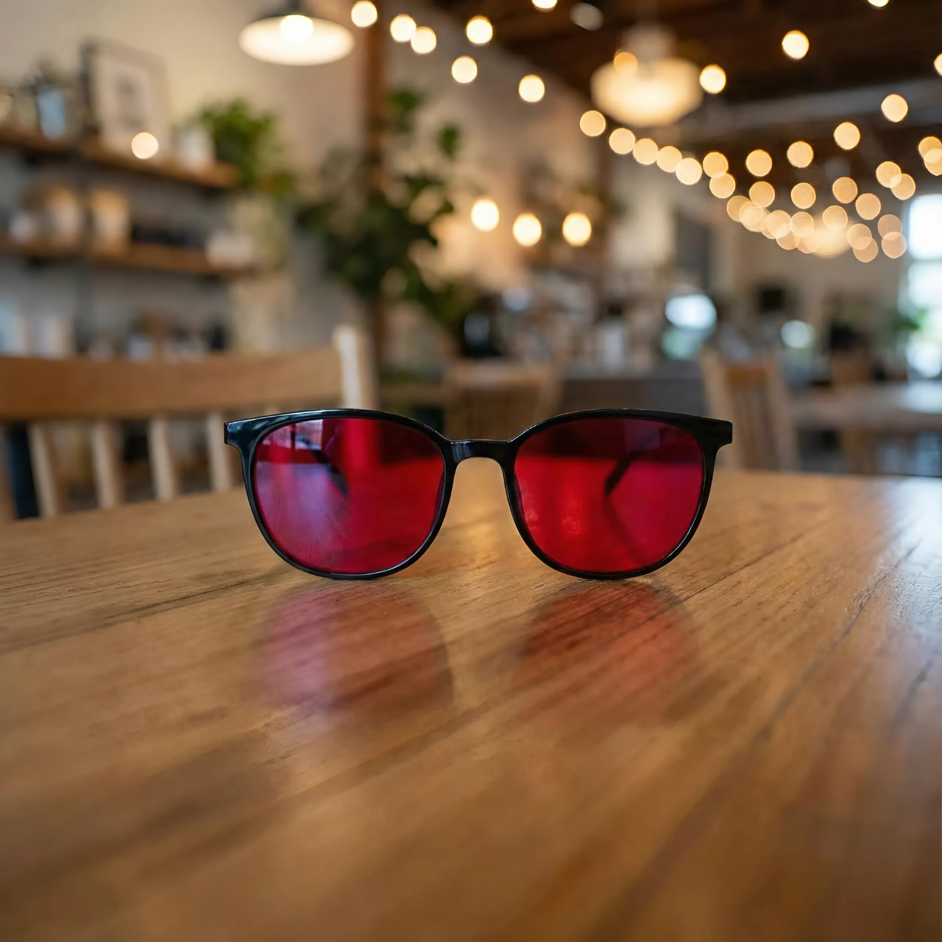 Las lentes rojas están pensadas para usar por la noche. Filtran la mayor parte de la luz azul y verde de alta intensidad, ayudando a relajar la vista antes de dormir y a reducir la estimulación visual de las pantallas.